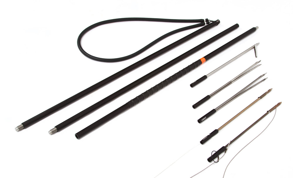 Made in the USA. A 5/8" diameter, 3pc travel spear not only breaks down into 34" segments but can also be converted into a 5'6" spear when the center section is removed. We'll send you an 8' band, be sure to add the 5'6" Phoenix band to your order if you want the versatility option of having two different spear sizes.