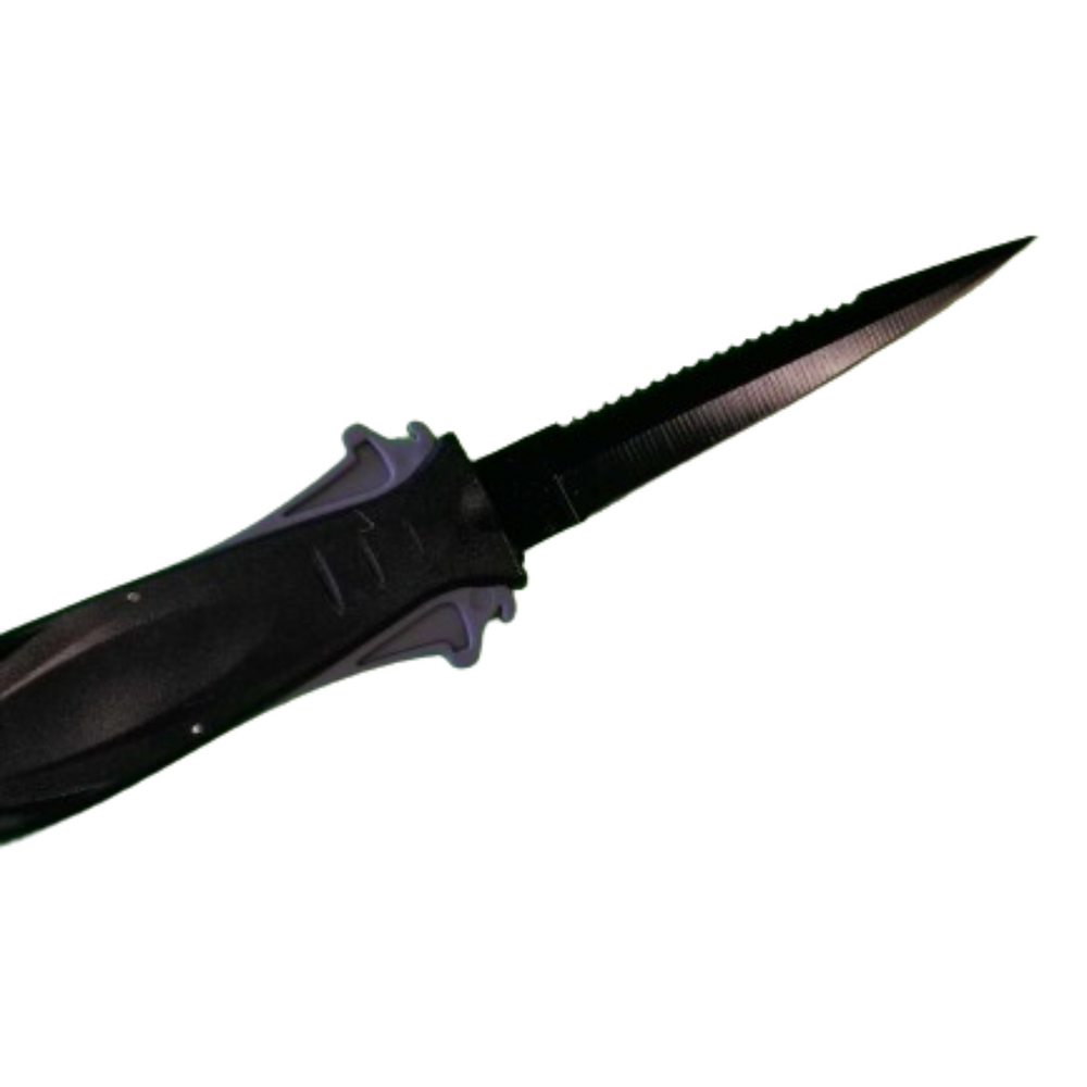 Introducing the all new Shiv-X, the perfect knife for freediving. This full tang knife is made from 416 stainless steel and features a black oxide finish for maximum corrosion resistance and sharpness retention, no-slip ergonomic polymer handle, low profile sheath, and a tapered double-edge blade ready to handle anything you throw at it. Blade measures 4.5 inches and features straight and serrated edges.