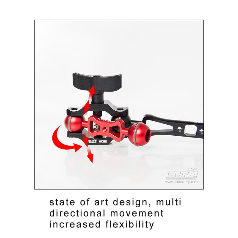 The AC22 premium version features a highly robust design, strong compression, and allows for a greater range of motion when connected to the Arms or Light joints. Also, you can attach a lanyard, or line with snap to the clamp for additional security of your system.