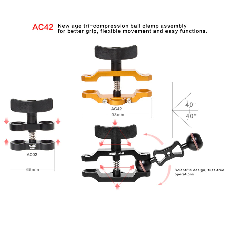 This is NOT your standard compression clamp.  The AC42 Extended version features a highly robust design, strong compression, and allows for a greater range of motion when connected to the Arms of Light joints. Also, you can attach a lanyard or line with a snap to the clamp for additional security of your system.