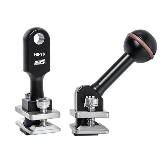 Reinforced Hot Shoe Mount with Stainless Steel base plate and anodized aluminum joints. Attaches directly to the hot shoe of your camera or the underwater housing.