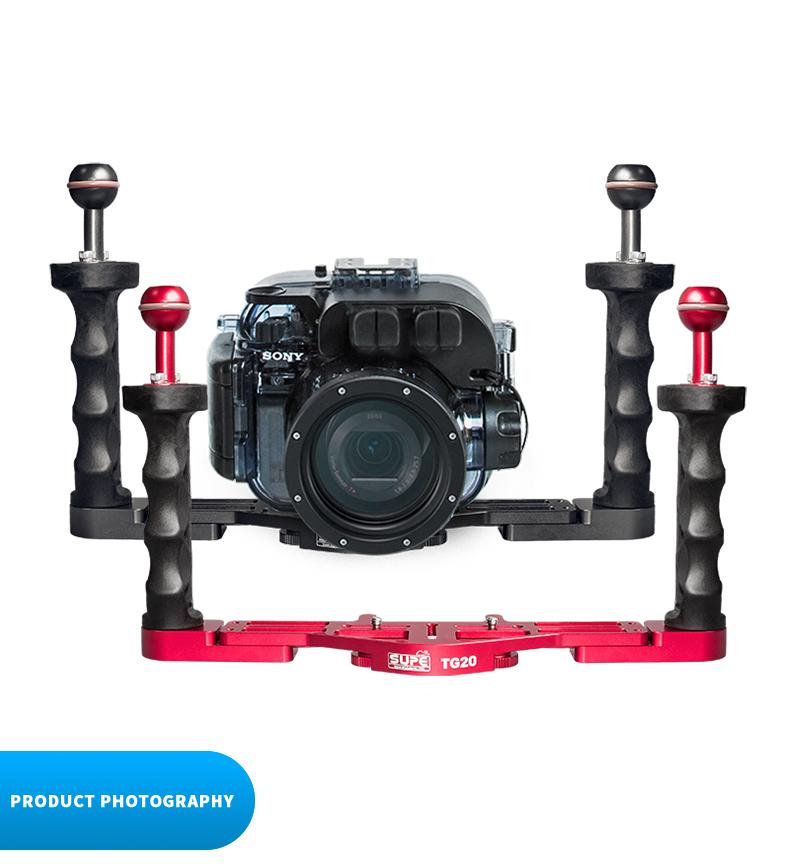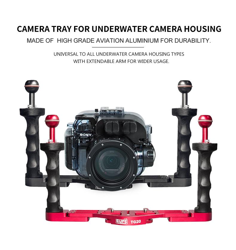 Light mounting system for stand underwater camera or housing. Dual Handles allow balanced handling when underwater